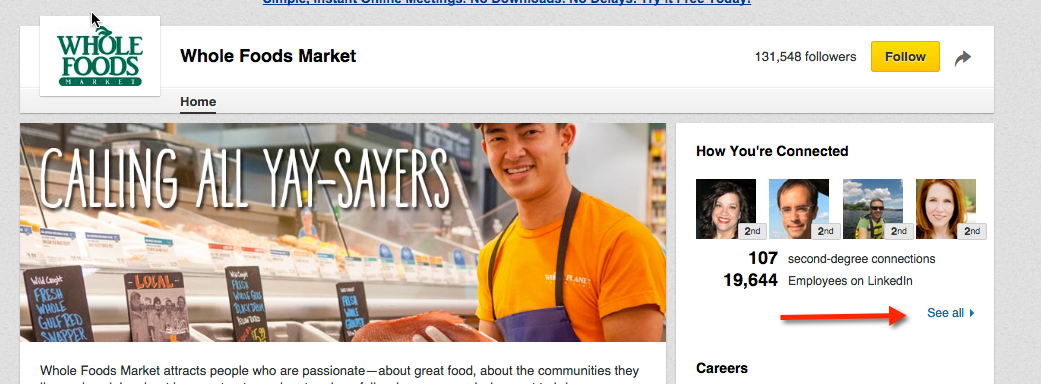In the upper right-hand corner of the company page you’ll also find a quick link to a listing of all the company’s employees with LinkedIn profiles. Depending upon what type of LinkedIn account you have, you can easily narrow down the list of employees to find others you may be looking for.